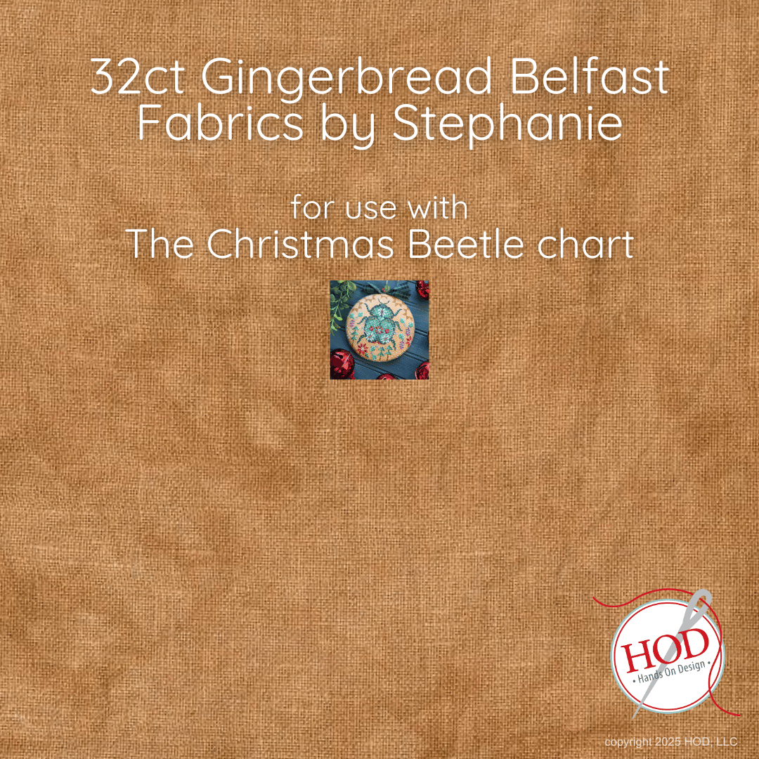 Linen – The Christmas Beetle – 16ct Gingerbread aida, (Fabrics by Stephanie). This cut is sized for The Christmas Beetle chart released at the Jingle Ball Aida